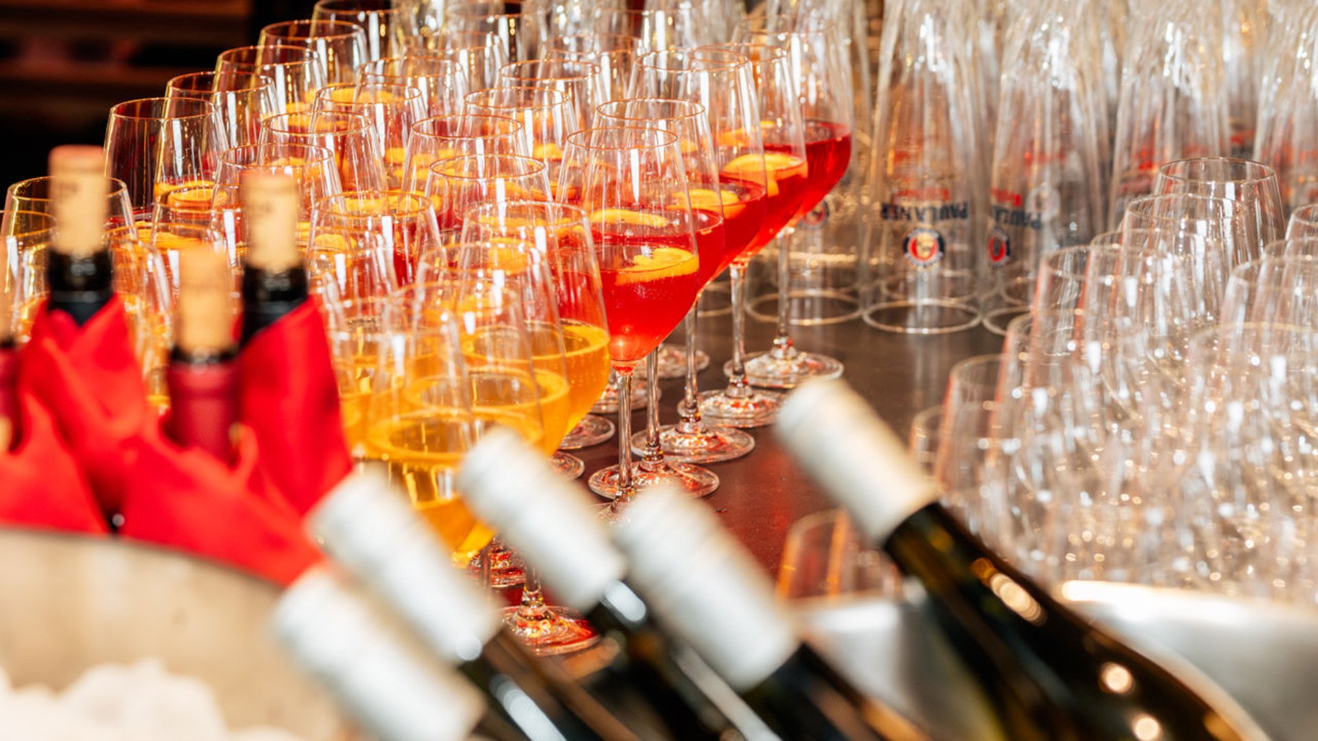 große Auswahl an Bier, Wein und Softgetränken (vor, während und nach der Show)